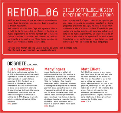 Posted on 03/11/200804/30/2011 Remor Festival. Girona (BCN) (July 1st, 2006) Remor Festival. Girona (BCN) (July 1st, 2006) Share this: Click to share on Facebook (Opens in new window) Facebook Click to share on WhatsApp (Opens in new window) WhatsApp Click to share on X (Opens in new window) X Like Loading... Related