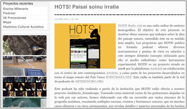HOTS! Radio #36 es una radio online de carácter monográfico. El objetivo de este proyecto es mostrar obras sonoras que trabajen sobre la idea del paisaje sonoro, entendido éste en su sentido más amplio. Los programas que HOTS! publica en formato podcast ofrecen diversos acercamientos y puntos de vista en relación a este siempre debatido concepto utilizando para ello el medio radiofónico como herramiena experimental. HOTS! es un proyecto creado en 2008 por la plataforma Audiolab en colaboración con el centro de arte contemporáneo Arteleku, y como parte de los proyectos desarrollados en torno al mapa sonoro del País Vasco SOINUMAPA.NET. Esta radio es también parte de la red de podcasts de ARTESONORO.ORG