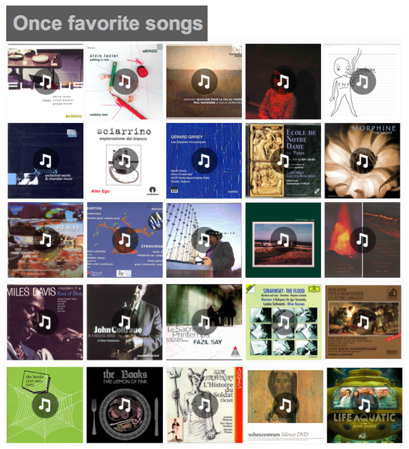 Posted on 03/09/201010/02/2011 Once favorite songs : · Memorial of songs that seduced me – Memoria de las músicas que me sedujeron · http://oncesongs.tumblr.com Like Loading... Related