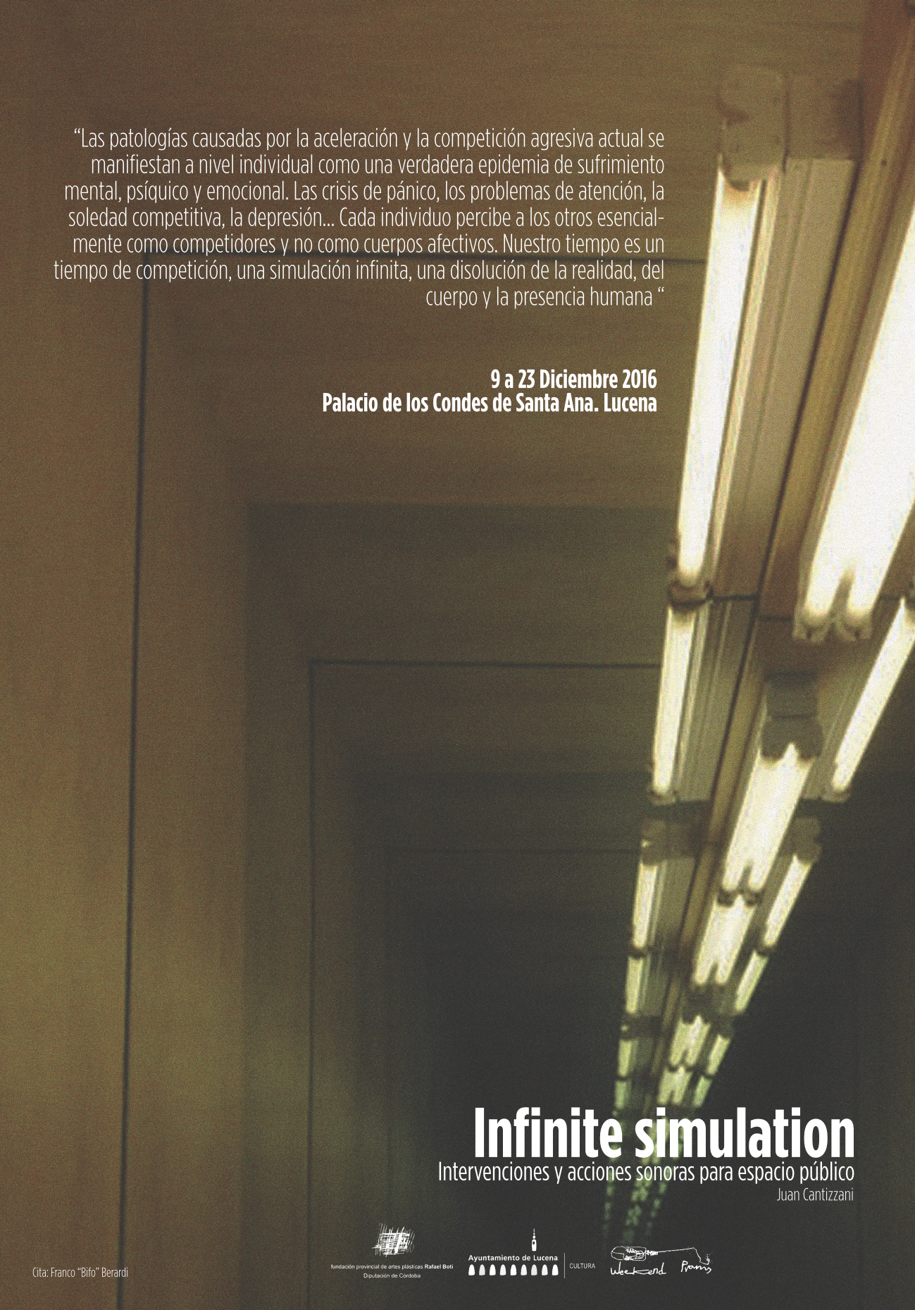 ” Las patologías causadas por la aceleración y la competición agresiva actual se manifiestan a nivel individual como una verdadera epidemia de sufrimiento mental, psíquico y emocional. Las crisis de pánico, los problemas de atención, la soledad competitiva, la depresión… Cada individuo percibe a los otros esencialmente como competidores y no como cuerpos afectivos. Nuestro tiempo es un tiempo de competición, una simulación infinita, una disolución de la realidad, del cuerpo y la presencia humana. “