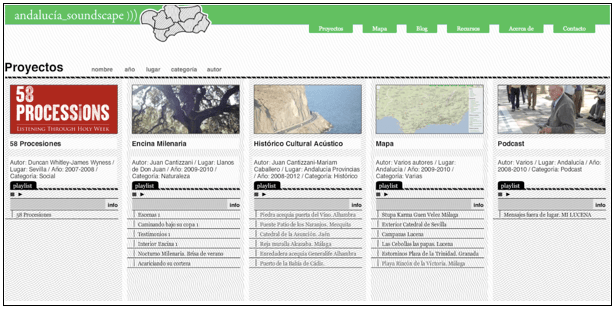 Con carácter público, la sección Mapa de Andalucia_Soundscape es un entorno colectivo y abierto, en el que de forma participativa cualquier persona pueda alojar escenas, eventos, marcas, señales acústicas… como medio para generar un relato fijado a un tiempo y a un lugar concreto, como elemento inmaterial que caracteriza e identifica el territorio y su contexto, como contribución en la construcción del patrimonio aural.
